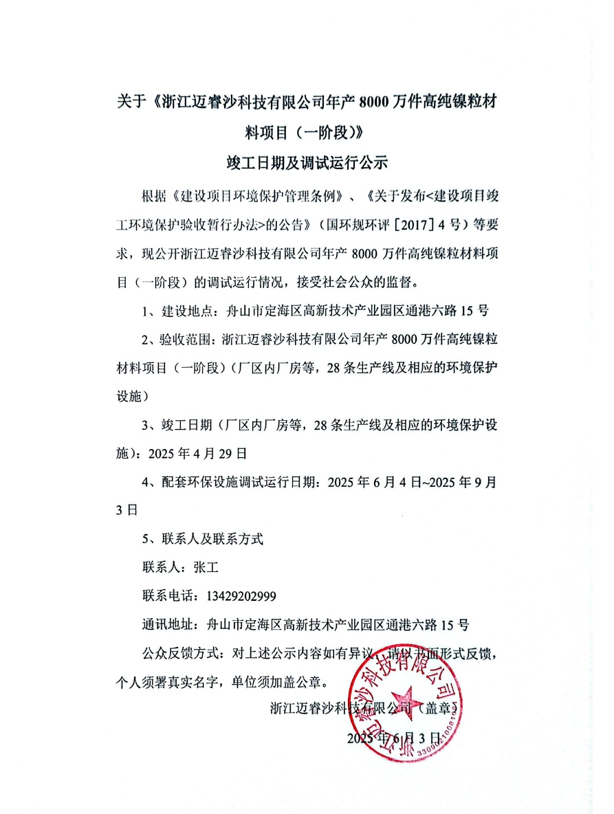 关于《浙江迈睿沙科技有限公司年产8000万件高纯镍粒材料项目(一阶段)》竣工日期及调试运行公示
