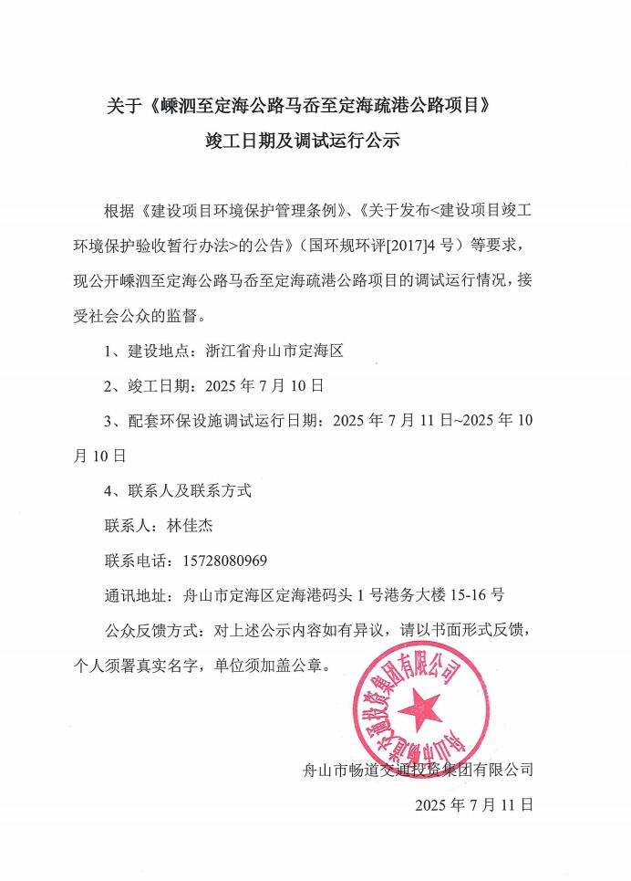 关于《嵊泗至定海公路马岙至定海疏港公路项目》竣工日期及调试运行公示