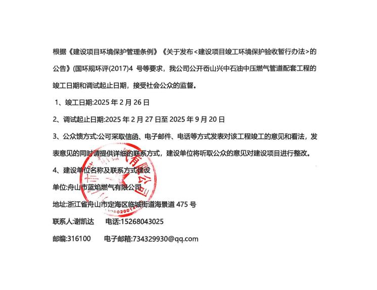 岙山兴中石油中压燃气管道配套工程竣工环境保护验收调查表、验收意见、其他情况说明