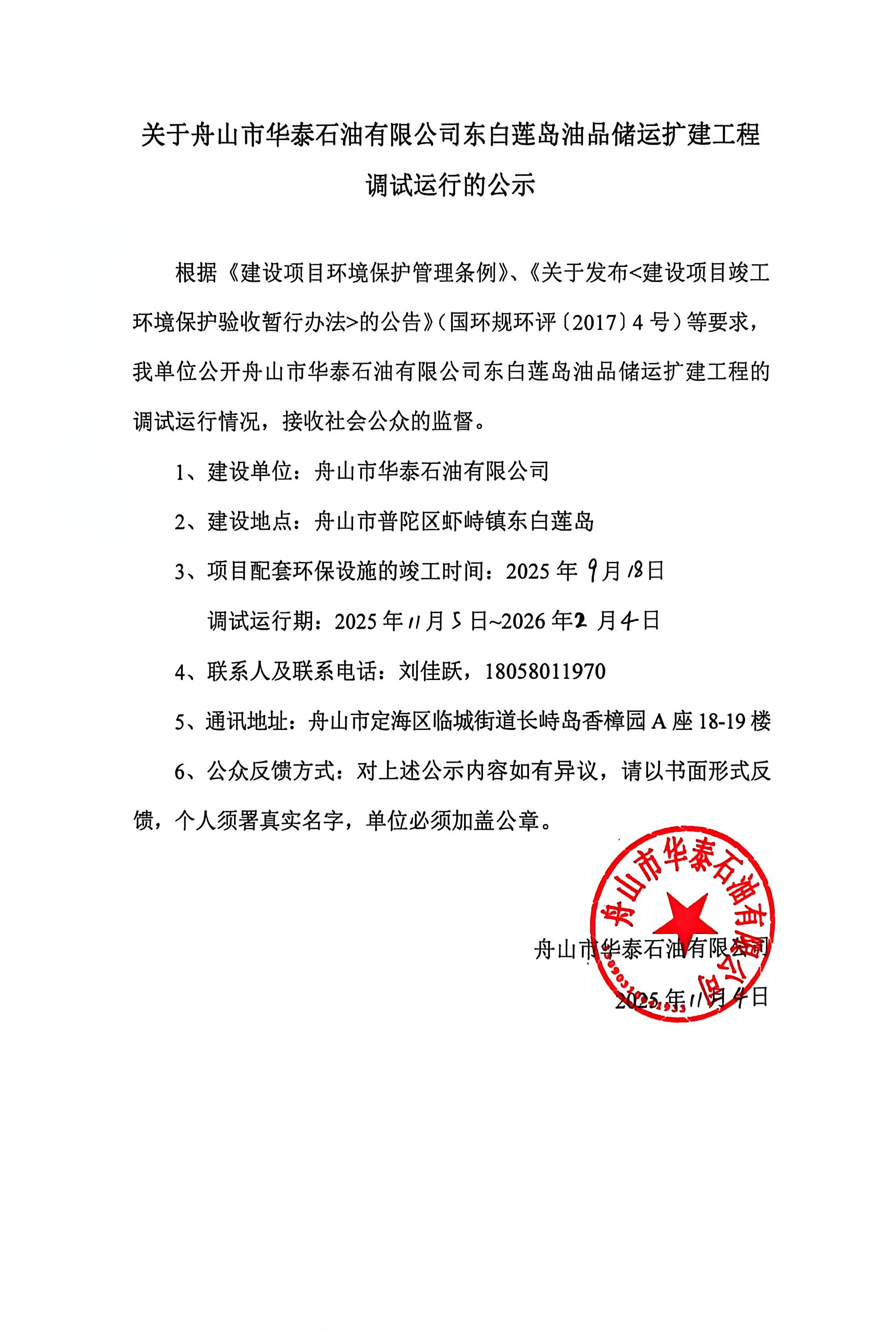 关于舟山市华泰石油有限公司东白莲岛油品储运扩建工程调试运行的公示