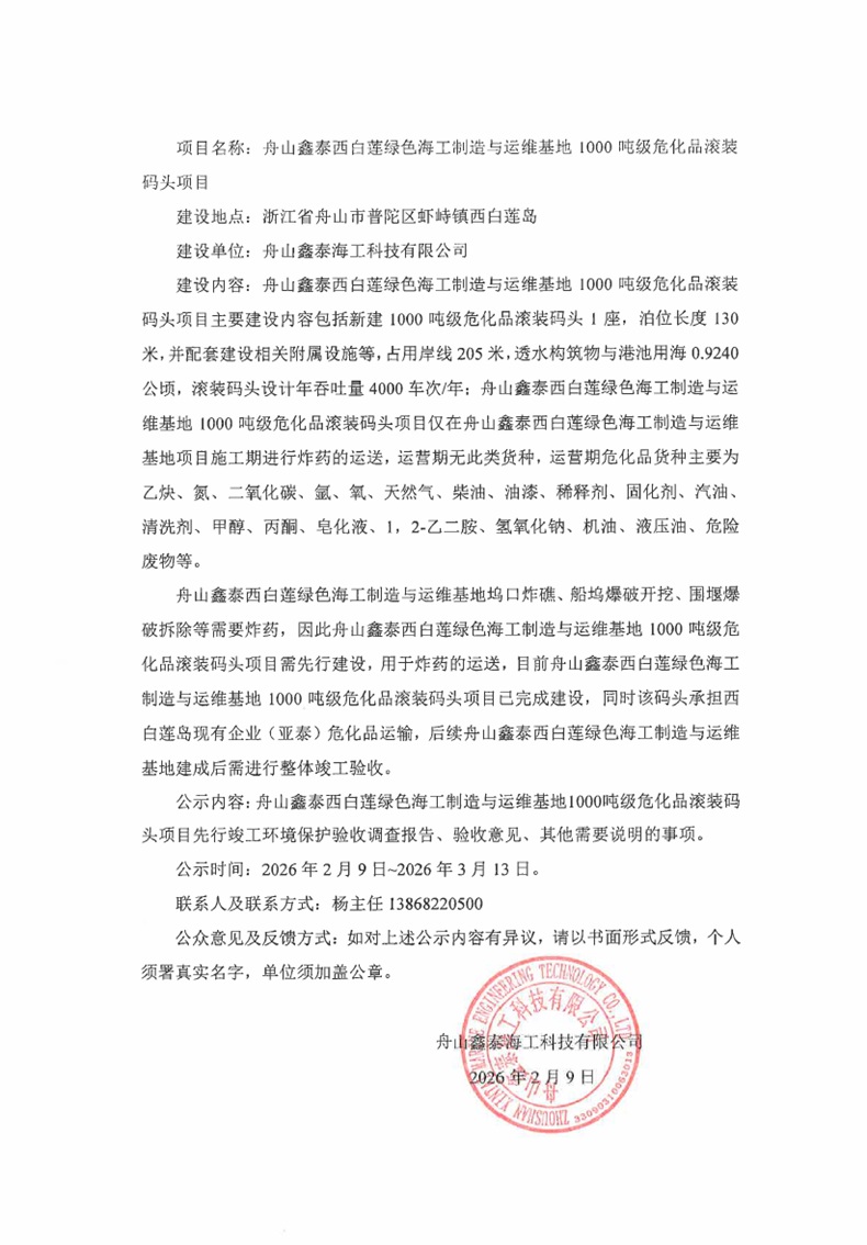 舟山鑫泰西白莲绿色海工制造与运维基地1000吨级危化品滚装码头项目先行竣工环境保护验收调查报告-公示稿.pdf 验收意见—舟山鑫泰西白莲绿色海工制造与运维基地1000吨级危化品滚装码头项目先行竣工环境保护验收调查报告.pdf 其他需要说明的事项—舟山鑫泰西白莲绿色海工制造与运维基地1000吨级危化品滚装码头项目先行竣工环境保护验收调查报告.pdf