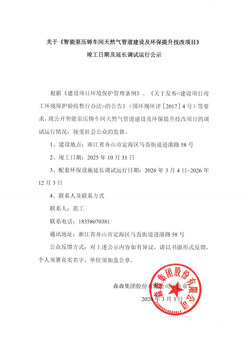 关于《智能泵压铸车间天然气管道建设及环保提升技改项目》竣工日期及延长调试运行公示