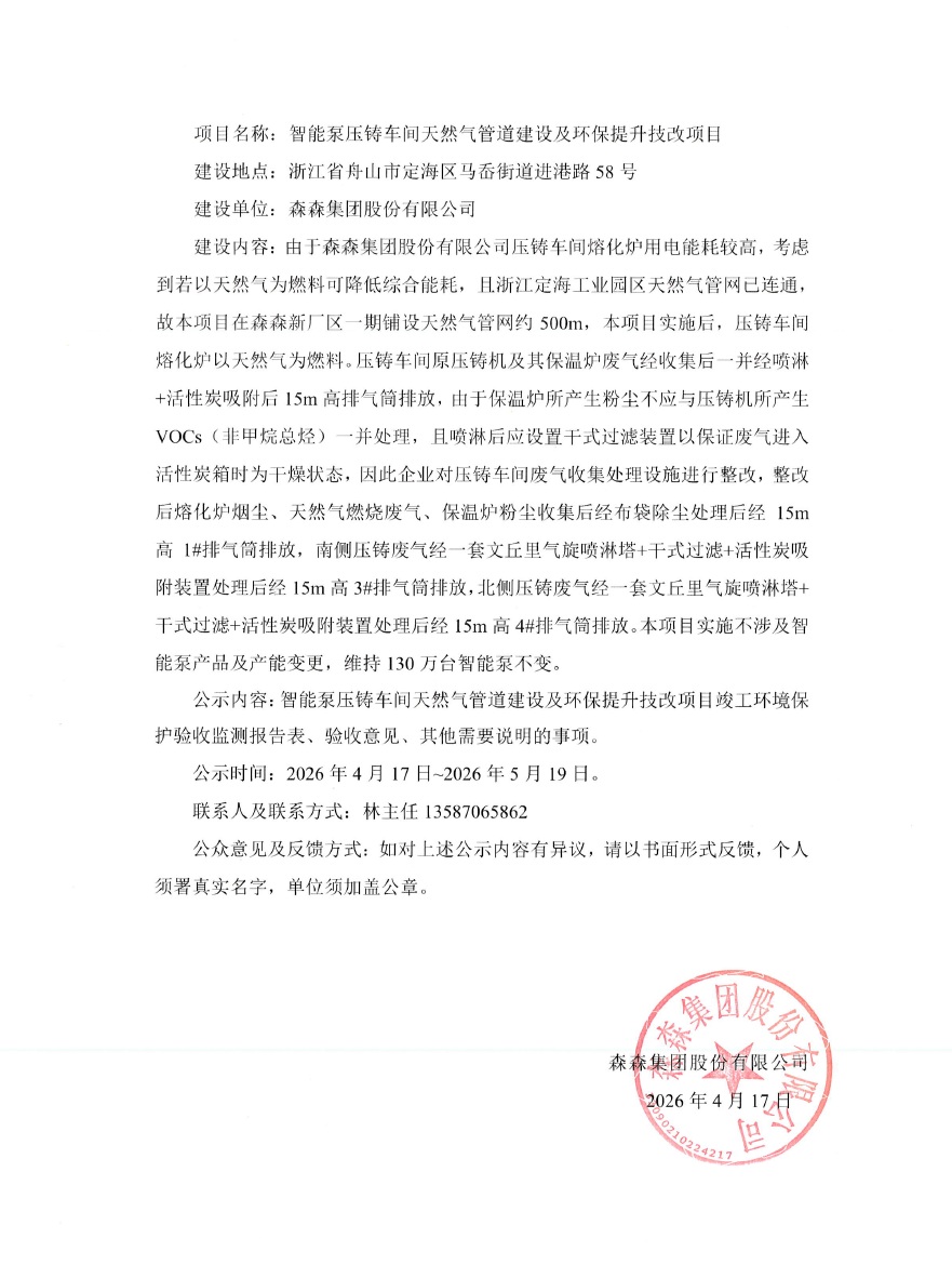 附件:公示稿—智能泵压铸车间天然气管道建设及环保提升技改项目竣工环境保护验收监测报告表.pdf 验收意见—智能泵压铸车间天然气管道建设及环保提升技改项目竣工环境保护验收监测报告表.pdf 其他需要说明的事项—智能泵压铸车间天然气管道建设及环保提升技改项目竣工环境保护验收监测报告表.pdf